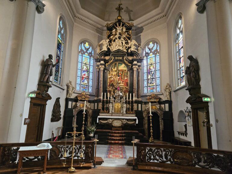 Wij betreden deze rijke historische plek op een vroege ochtend, er heerst sereniteit, het gefilterde licht valt door de prachtige gebrandschilderde ramen.
